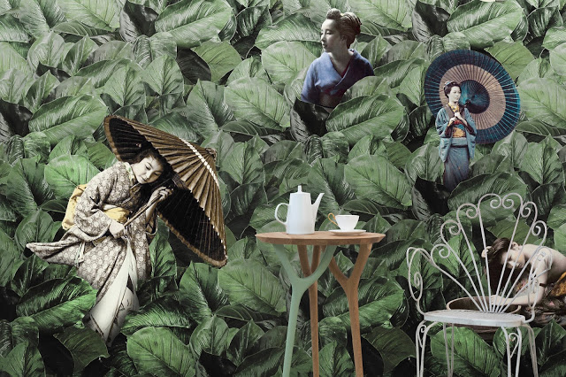 Un collage, composto da vegetazione dai colori saturi, must per le grafiche contemporanee e donne giapponesi ritratte nelle albumine dell’ottocento, per la capsule collection di carte da parati progettata per texturae.