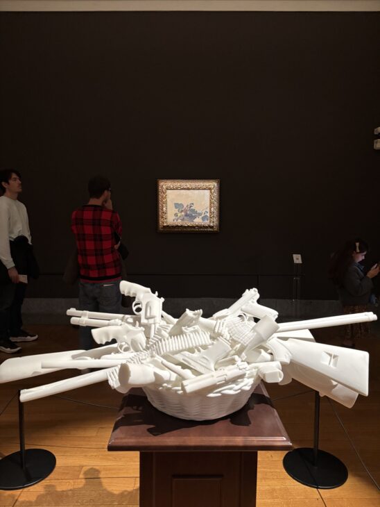 Davanti, Jago propone un cesto pieno di armi scolpite nel marmo. Pistole, fucili, mitragliatori: strumenti di morte racchiusi in una forma che richiama la tradizione artistica. È una “natura morta” contemporanea, che ci costringe a riflettere su cosa oggi mettiamo nei nostri cesti, nei nostri simboli di abbondanza.