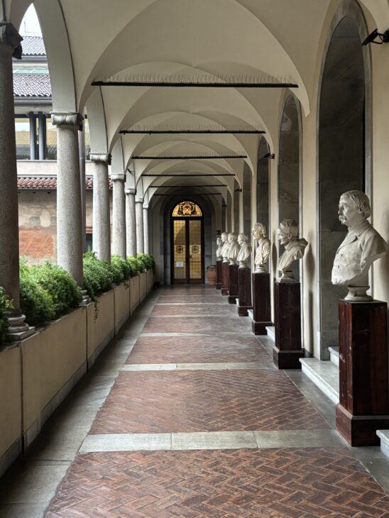 Prima di uscire, vale la pena fermarsi ancora un momento nel cortile e nella biblioteca: due luoghi che completano l’esperienza della Pinacoteca Ambrosiana con grazia e silenzio.